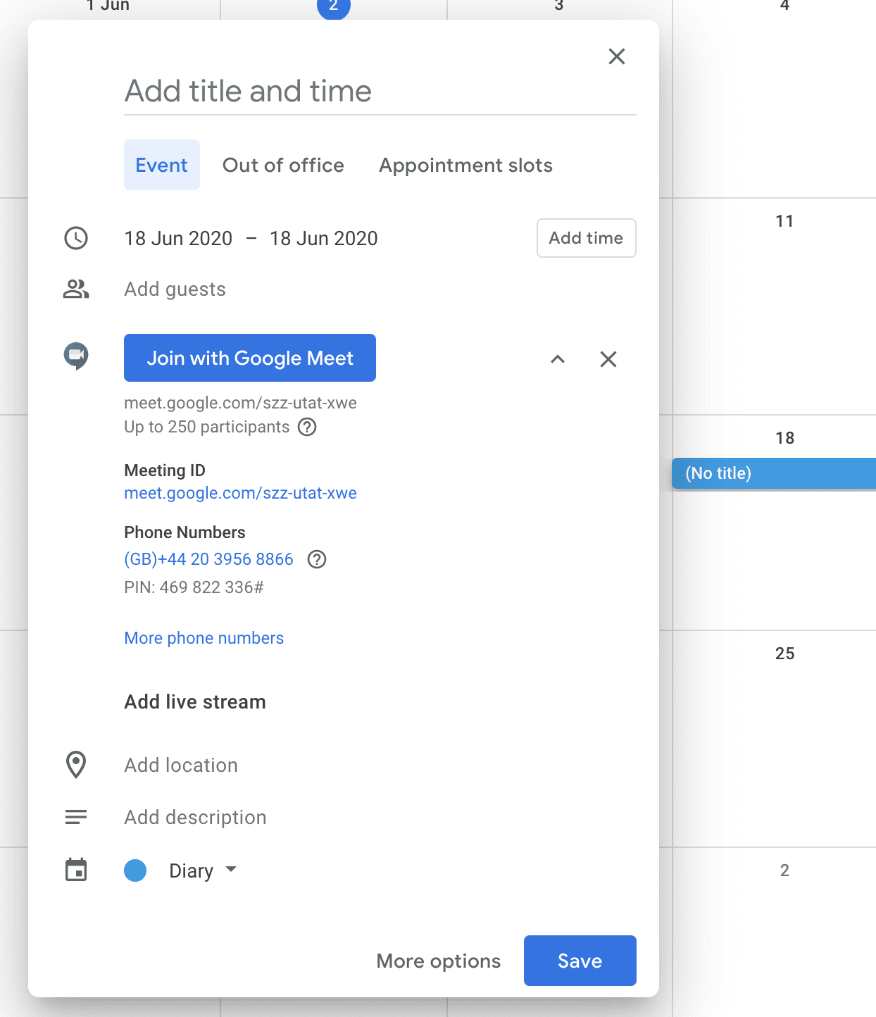 One of the other cool features you get with Google Calendar once you go to the Business tier and upwards, is the ability to add conference calling features to an event. No messing around in separate products, you simply add video conferencing to the event and all attendees get an invite with join in details as well as a voice dial-in number if they aren't going to make the video call.