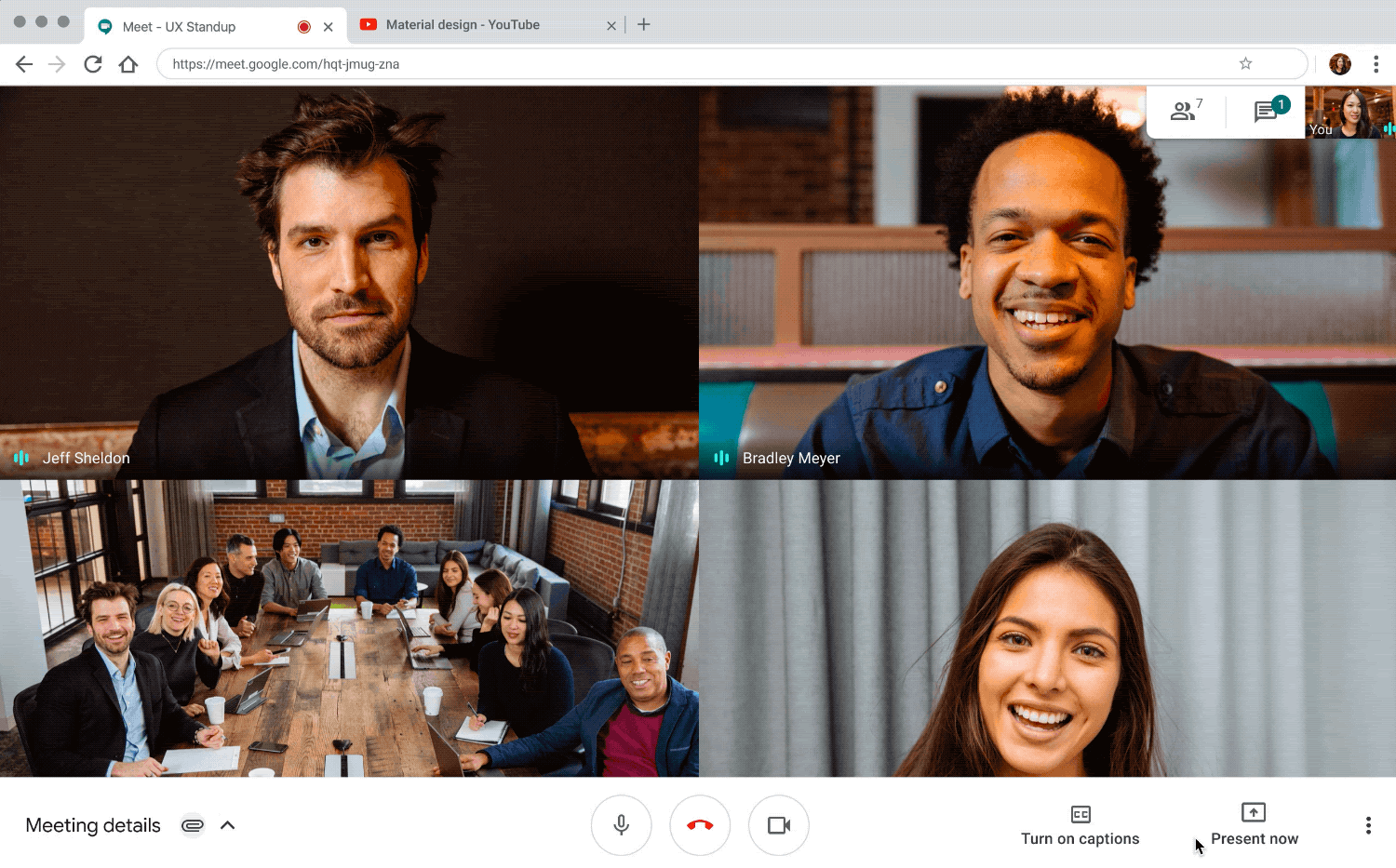 Participants can also share screen content, or when they are using Google Chrome, a single browser tab, which is pretty neat when you need to show somebody something. The Enterprise version also allows users to record their meetings to re-watch.